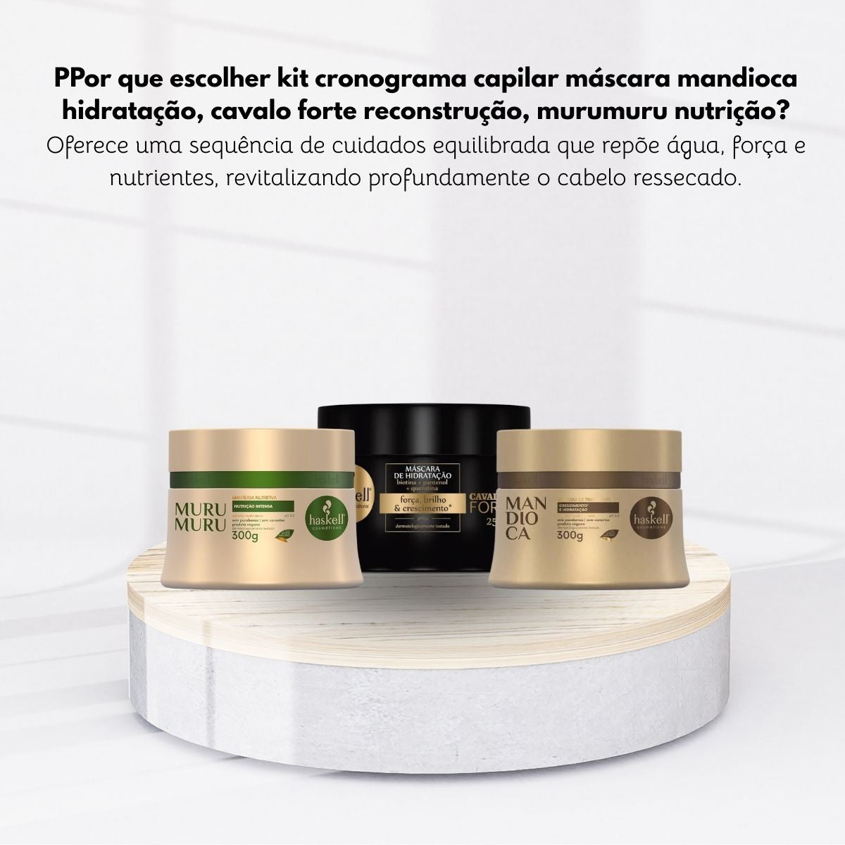 O Cronograma Haskell Cabelo Forte Máscaras foi criado para proporcionar um tratamento completo aos fios, unindo hidratação, nutrição e reconstrução. As máscaras Muru Muru, Cavalo Forte e Mandioca atuam de forma complementar, devolvendo força, brilho e vitalidade ao cabelo. Ideal para restaurar a saúde capilar e manter os fios resistentes e macios em todas as etapas do cronograma.