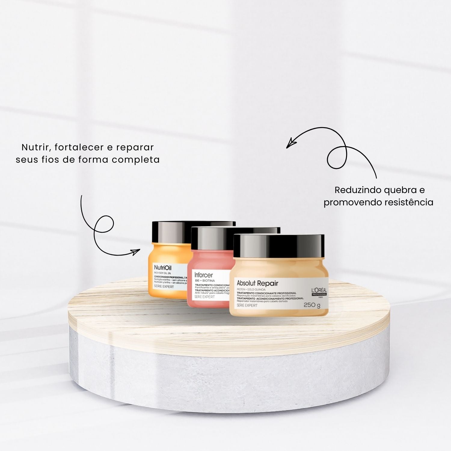 Este cronograma capilar foi cuidadosamente montado para nutrir, fortalecer e reparar seus fios de forma completa. A máscara NutriOil restaura lipídios perdidos, repõe óleo e brilho; a Inforcer age na reconstrução interna, reduzindo quebra e promovendo resistência; e a Absolut Repair reconstrói as áreas danificadas, reconstruindo a fibra capilar. Juntas, essas máscaras compõem uma rotina profissional que entrega nutrição, força e reparação profunda aos cabelos.