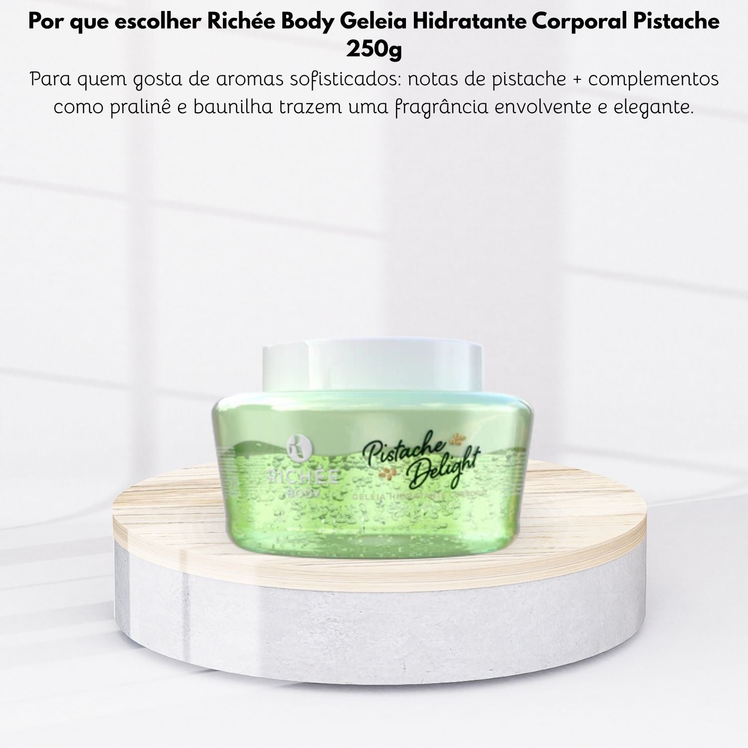 - Geleia Hidratante Corporal Pistache Richée: prolonga a hidratação e a perfumação.